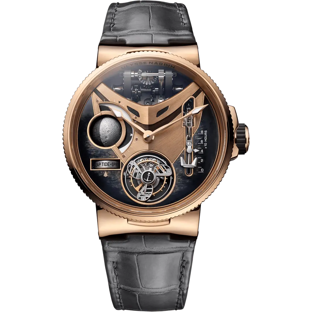 Fonksiyonlar: Saat ve dakika. Kurma mekanizmasına bağlı çapa ve ırgat ile güç rezervi. Ay evresi göstergesi. Gelgit katsayıları ve hacimlerinin göstergesi. Uçan turbiyon.
