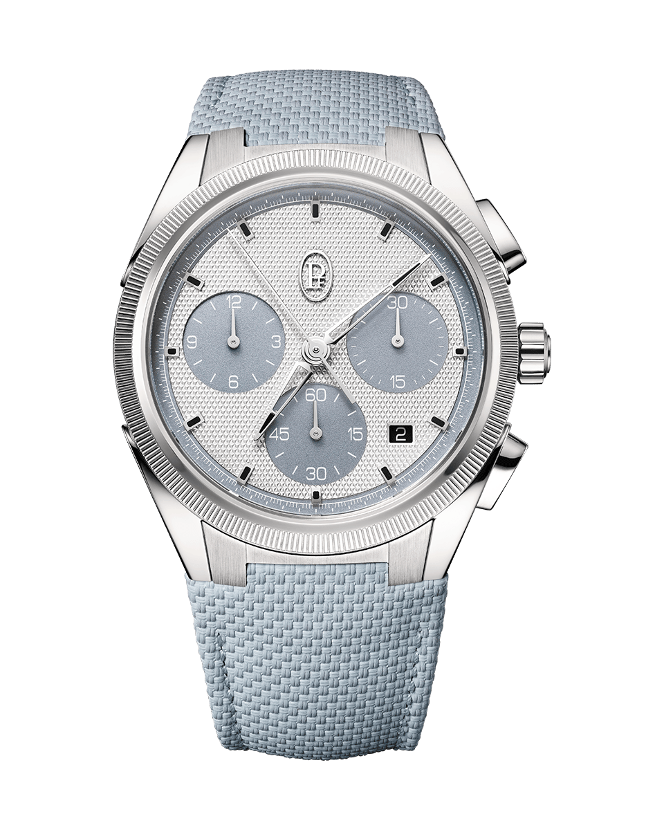TONDA PF Sport Kronograf 42 mm çapındadır ve sportif karakterini vurgulayan cesur bir ışık ve yansıma etkileşimi yaratan belirgin bir tırtıklı çerçeveye sahiptir. Kadran, elle guilloche yapılmış 'üçgen çivi' deseniyle dekore edilmiştir. Uygulanan saat işaretleri siyah SuperLuminova ile kaplanmıştır.