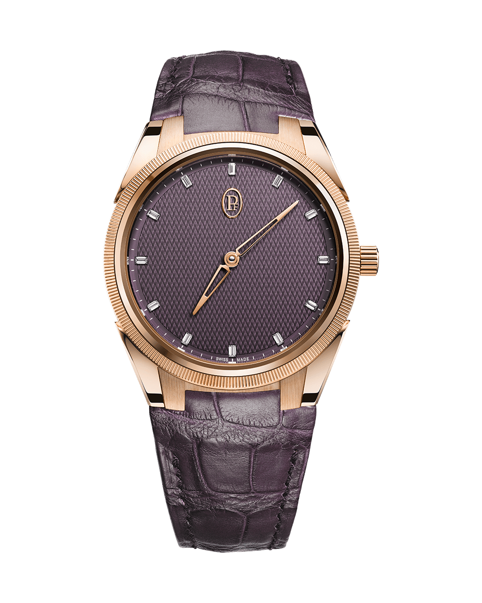 Tamamen 18 ayar pembe altından yapılmış TONDA PF Automatic 36 mm'yi keşfedin. Bu zarif parça, Parmigiani Fleurier'in sembolik bir tonu olan, elle guilloché edilmiş, hassas bir şekilde zıtlık oluşturan "Sıcak Gri" kadrana sahiptir. Daha koyu renk tonu, saat işaretlerini oluşturan görünmez yerleştirilmiş baget kesim pırlantaları vurgular ve bu pırlantalar, çerçeveye yerleştirilmiş parlak kesim pırlantaları gizlice tamamlayarak karmaşık tırtıklı yapısını vurgular.