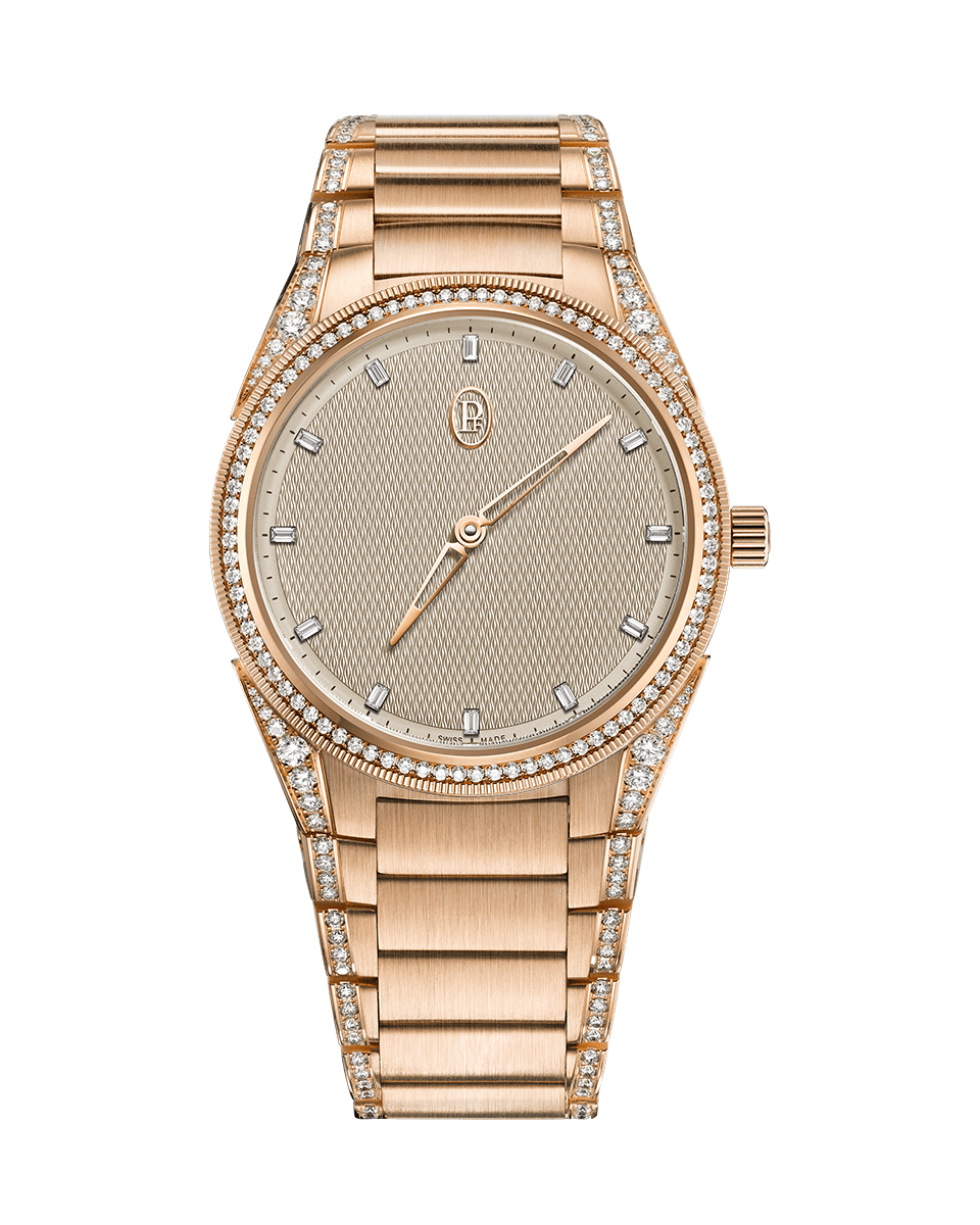 TONDA PF Automatic 36mm hem gösterişli hem de narindir. 18 ayar pembe altından yapılmış ve elmaslarla süslenmiştir, Parmigiani Fleurier'in varsayılan hafiflik ve kıymetliliğinin ruhunu ustaca çağrıştırır. Değerli taşların taçtan bileziğin yanlarına doğru izlediği desen, modele tam görsel kimliğini verir ve bileziğin akışkanlığını artırır.