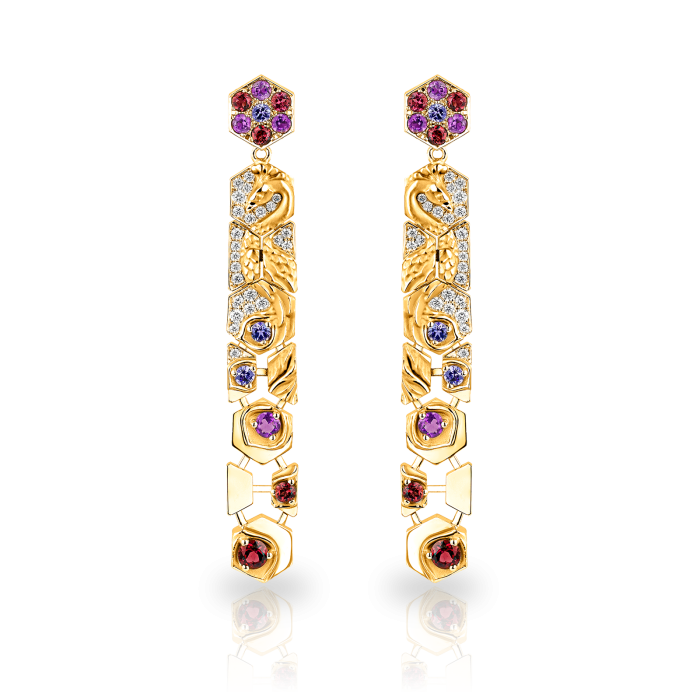 Origen Koleksiyonu'ndan ''Jardín de los Placeres'' Küpeleriyle cazibenizi artırın. Bu zarif küpeler 18 ayar sarı altından üretilmiştir ve muhteşem bir dizi elmas, tanzanit, ametist ve rubelitle süslenmiştir. Ortalama 18,07 gram ağırlığında olan bu lüks parçalar, sofistikelik ve zarafetin mükemmel bir karışımını sunarak onları her türlü kaliteli mücevher koleksiyonunun olmazsa olmazı haline getirir.