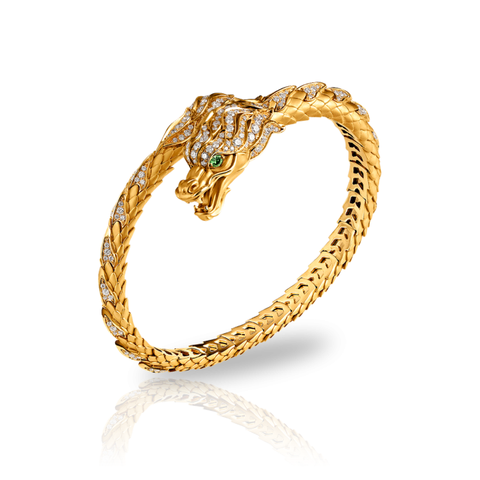 New Shanghai Koleksiyonu'ndan New Shanghai Flex Pave Bileziğinin ihtişamını keşfedin. 18 ayar sarı altından üretilen bu muhteşem bilezik, toplam 2,58 karat ağırlığında 253 beyaz elmas ve 0,08 karat ağırlığında 2 yeşil elmas sergiliyor. Ortalama ağırlığı 33,91 gram olan bu bilezik, zarif lüksü ve sofistike tasarımı temsil ediyor.
