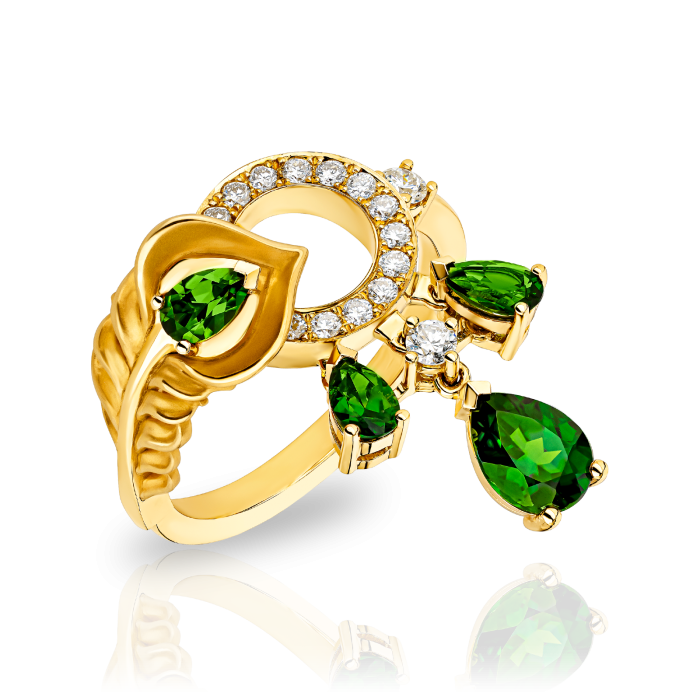 Origen Koleksiyonu'ndan 18 ayar sarı altından yapılmış ve ışıltılı elmaslar ve kromodioritler ile süslenmiş ''Mistral'' Yüzüğü keşfedin. Ortalama ağırlığı 6,22 gram olan bu zarif yüzük, her kıyafete lüks ve zarafet katar.
